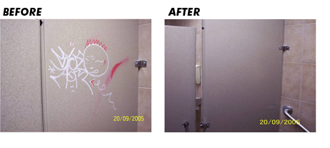 Quickly and easily removes all types of permanent marker and paint pen, any kind of pen or ink, whiteout, etc. from washroom stalls, lockers, tables, glass (windows) doors & any kind of painted surface.